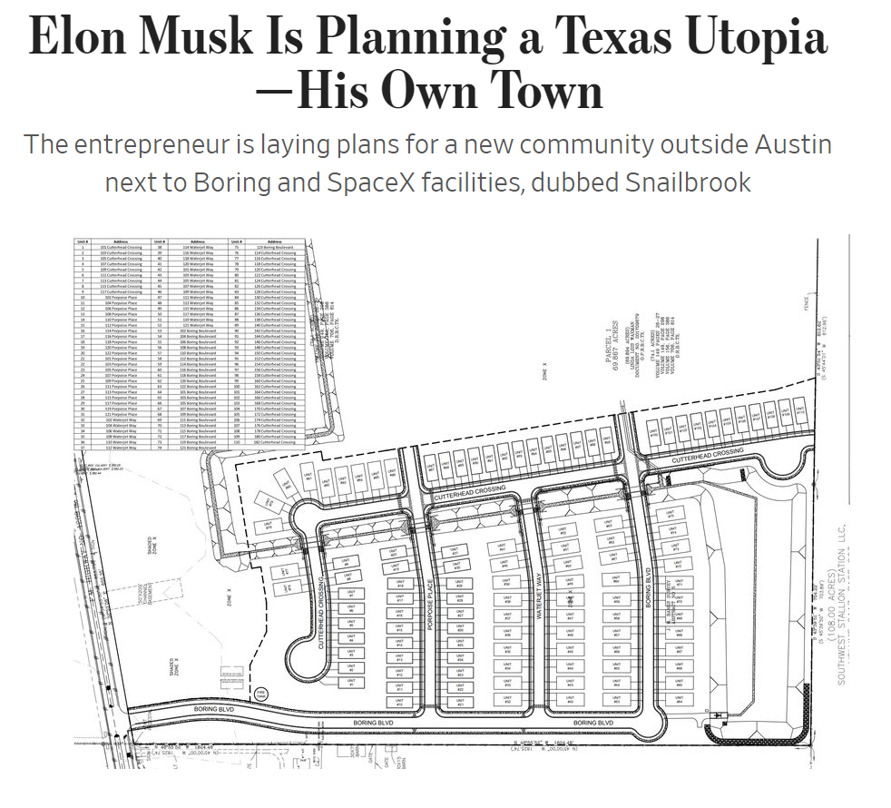 报道称,马斯克计划在这片土地中建造一个名为“蜗牛溪”(Snailbrook)的小镇。这个名称显然是指其基础设施和隧道建设公司The Boring Company的吉祥物。在描述他的“隧道梦”时,马斯克曾戏称,要制造出移动速度“比蜗牛快”的掘进机。